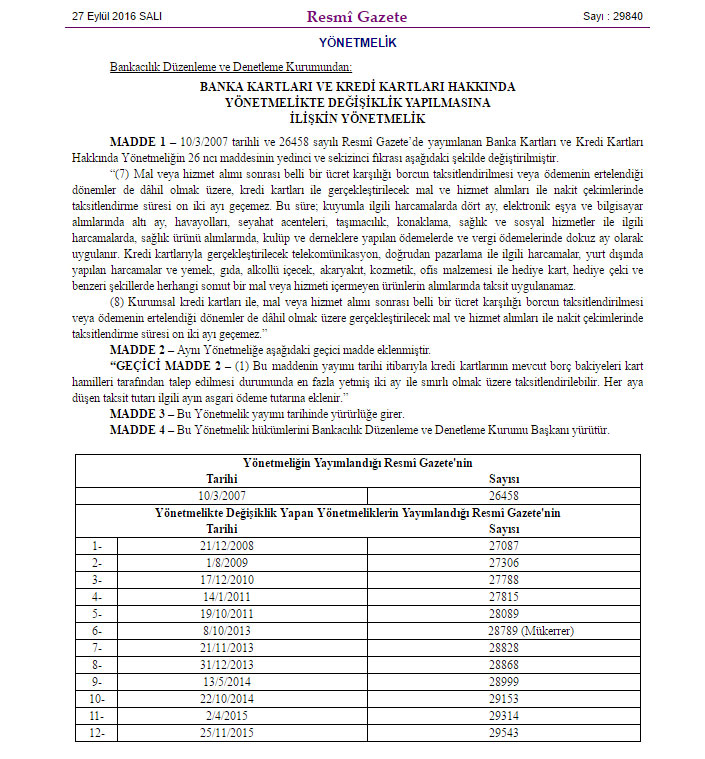 27 Eylül 2016 tarihinde yayınlanan yönetmelik değişikliği ile kozmetik ürünlerde kredi kartına taksit uygulaması kaldırılmıştır. ilgili yönetmelik metninin resmi aşağıda yer almaktadır.