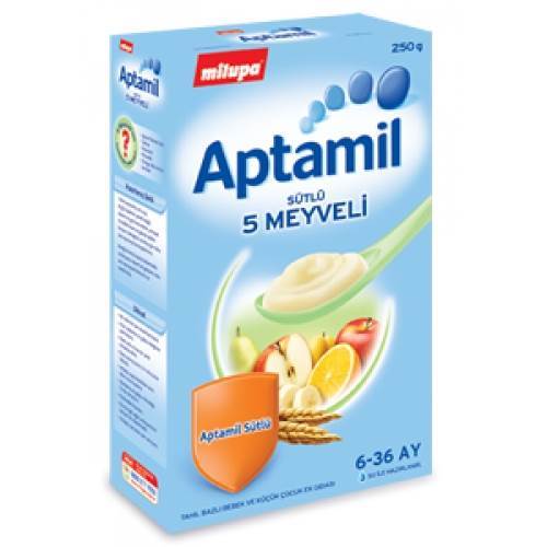 Aptamil Sütlü 5 Meyveli, bileşimindeki aptamil prebiyotikli lif karışımına sahip Aptamil sütü ile bebeğinizin bağışıklık sistemini destekleyen bir kaşık mamasıdır.