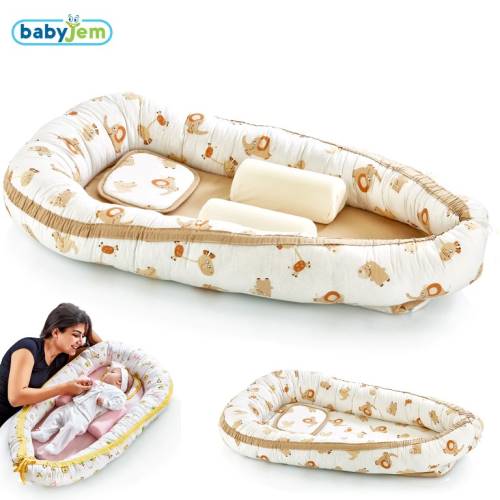 Babyjem Anne & Baba Yanı Bebek Yatağı küçük bir yuva gibidir. Beşikte, karyolada , arabada, oyun parkında , ya da anne babanın yatağında kullanılabilir. Bebeği çevreleyerek güvenle uyumasını sağlar.Yan yatma yastıkları bebeğinizin doğru pozisyonda uyumasına yardımcı olur. 0 - 6 ay arası kullanıma uygundur. Ürün İçeriği:%100 pamuk