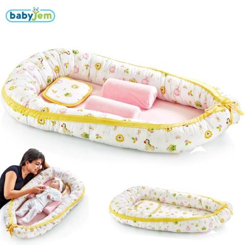 Babyjem Anne & Baba Yanı Bebek Yatağı küçük bir yuva gibidir. Beşikte, karyolada , arabada, oyun parkında , ya da anne babanın yatağında kullanılabilir. Bebeği çevreleyerek güvenle uyumasını sağlar.Yan yatma yastıkları bebeğinizin doğru pozisyonda uyumasına yardımcı olur. 0 - 6 ay arası kullanıma uygundur. Ürün İçeriği:%100 pamuk