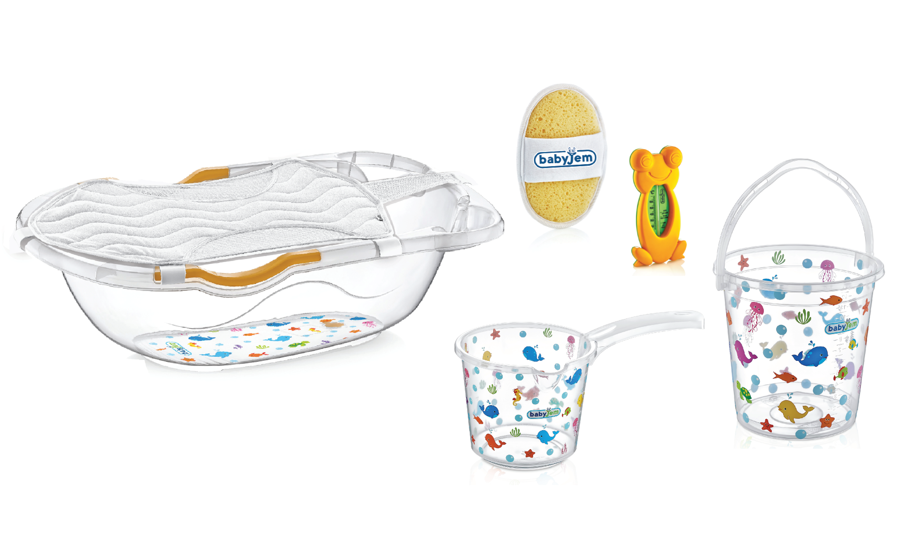 Şık hediyelik kutusunda satışa sunulan babyjem banyo seti içerisinde 1 adet giderli büyük banyo küveti, 1 adet banyo kovası, 1 adet maşrapa, 1 adet banyo filesi ve 1 adet lastikli bebek yıkama süngeri ve 1 adet banyo termometresi mevcuttur.