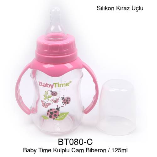 BabyTime Silikon Kiraz Uçlu Kulplu Cam Biberon 150ml - Pembe