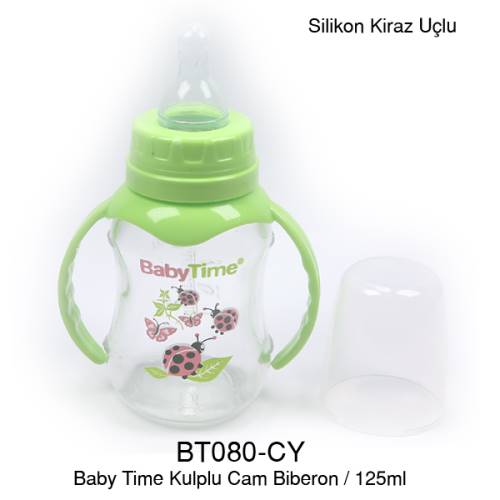 BabyTime Silikon Kiraz Uçlu Kulplu Cam Biberon 150ml - Yeşil