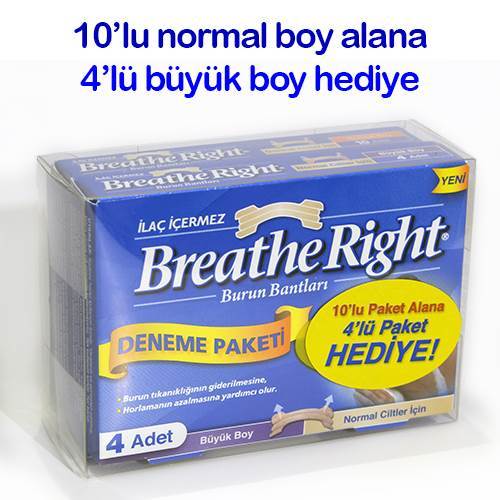 Paket içeriğinde 10 adet Breathe Right Burun Bandı Büyük Boy ve 4'lü deneme paketi hediye.