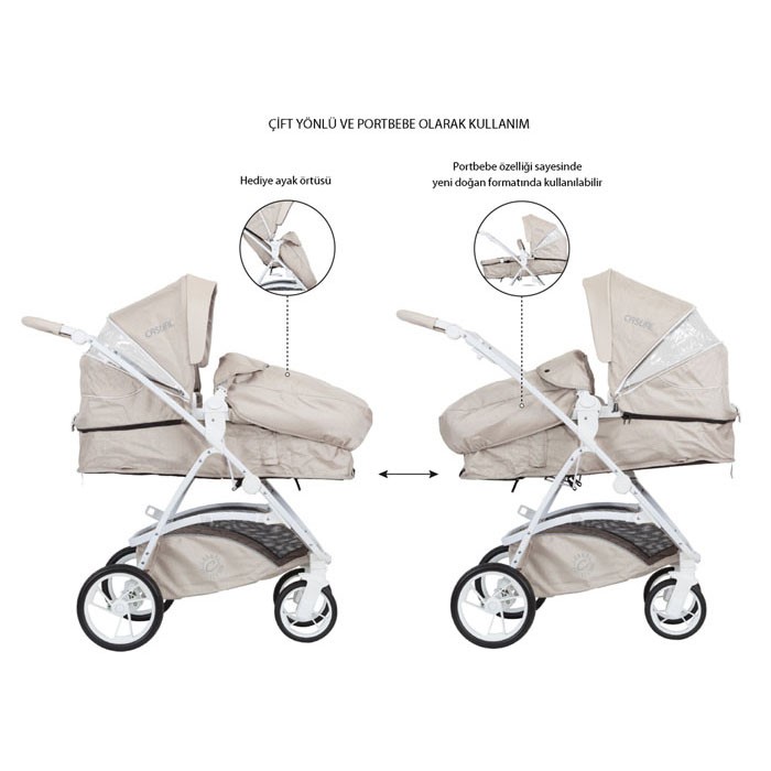 Adaptör sayesinde bebek arabasına takılarak travel sistem olarak kullanılabilir