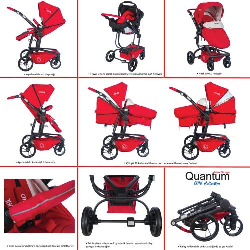 Casual Quantum travel sistem bebek arabası cesur bir tasarıma sahiptir. Akıllı tasarımı ve kolay kullanım özellikleri ile şehirde kullanım için mükemmeldir. Tasarım tercihi olanlar için fark edilir bir seçenektir. Üstelik gece kolay fark edilmeyi sağlayan kazaları önleyici reflektörler ve oturma ünitesi ile birlikte katlanabilme, katlandığında otomatik kitlenme gibi akıllı özelliklere sahiptir. Göz alıcı ve yenilikçi tasarıma sahip Quantum ile sokakları keşfetmeye hazır olun! • % 100 Alüminyum ultra hafif şase • Portbebe olarak kullanılabilen oturma ünitesi • 3 pozisyona ayarlanabilen oturma ünitesi • 3 pozisyona ayarlanabilen oturma ünitesi • Yükseklik ayarlanabilen ergonomik itme kolu • Çıkarılabilir ve reflektörlü ön bar • Tentede yer alan fermuarlı pencere sayesinde bebeği görebilme imkanı • İtme sapında fermuarlı koruyucu kumaş kılıf • Oturma ünitesi ile birlikte katlanabilme özelliği • Ayarlanabilen ve kolay temizlenen deri ayak dayanağı • Katlandığında otomatik kitlenme ve az yer kaplama özelliği • Taşıma oto koltuğu, bebek arabasına monte edilerek travel sistem olarak kullanılabilir • Gece kolay fark edilmeyi sağlayan kazaları önleyici reflektörler • 360° dönebilen ve sabitlenebilen ön tekerler • Kolay çıkarılabilen rulman ön ve arka tekerler • ECE R44-04 Belgeli 0-13 kg ana kucağı oto koltuğu • Süspansiyonlu arka tekerlerde tek tuş fren sistemi • 5 nokta emniyet kemeri • Özel dizayn edilmiş alt sepeti • Garanti süresi 24 ay