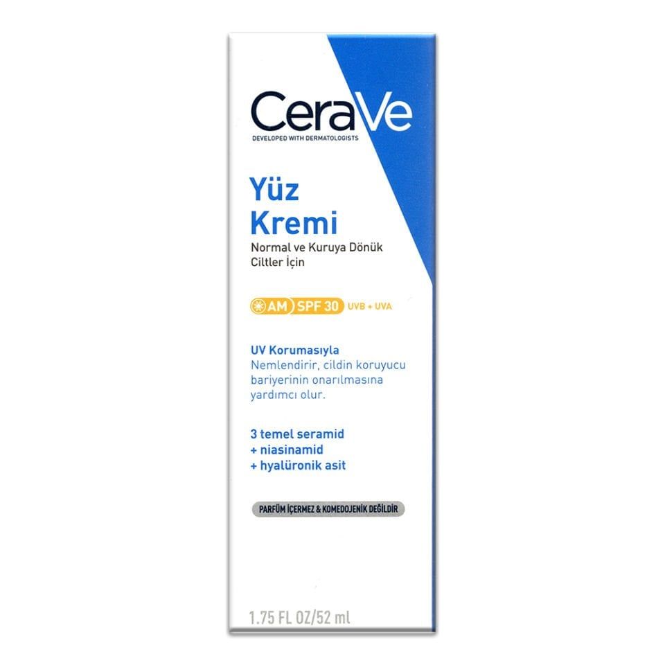 - Cerave Yüz Kremi 52 ml SPF 30, yüz ve boyundaki koruyucu cilt bariyerinin onarılmasına yardımcı olur.