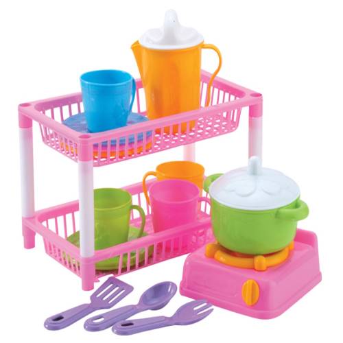 17 parçadan oluşan İki Katlı Oyuncak Mutfak Set içinde bulunan mutfak malzemeleri