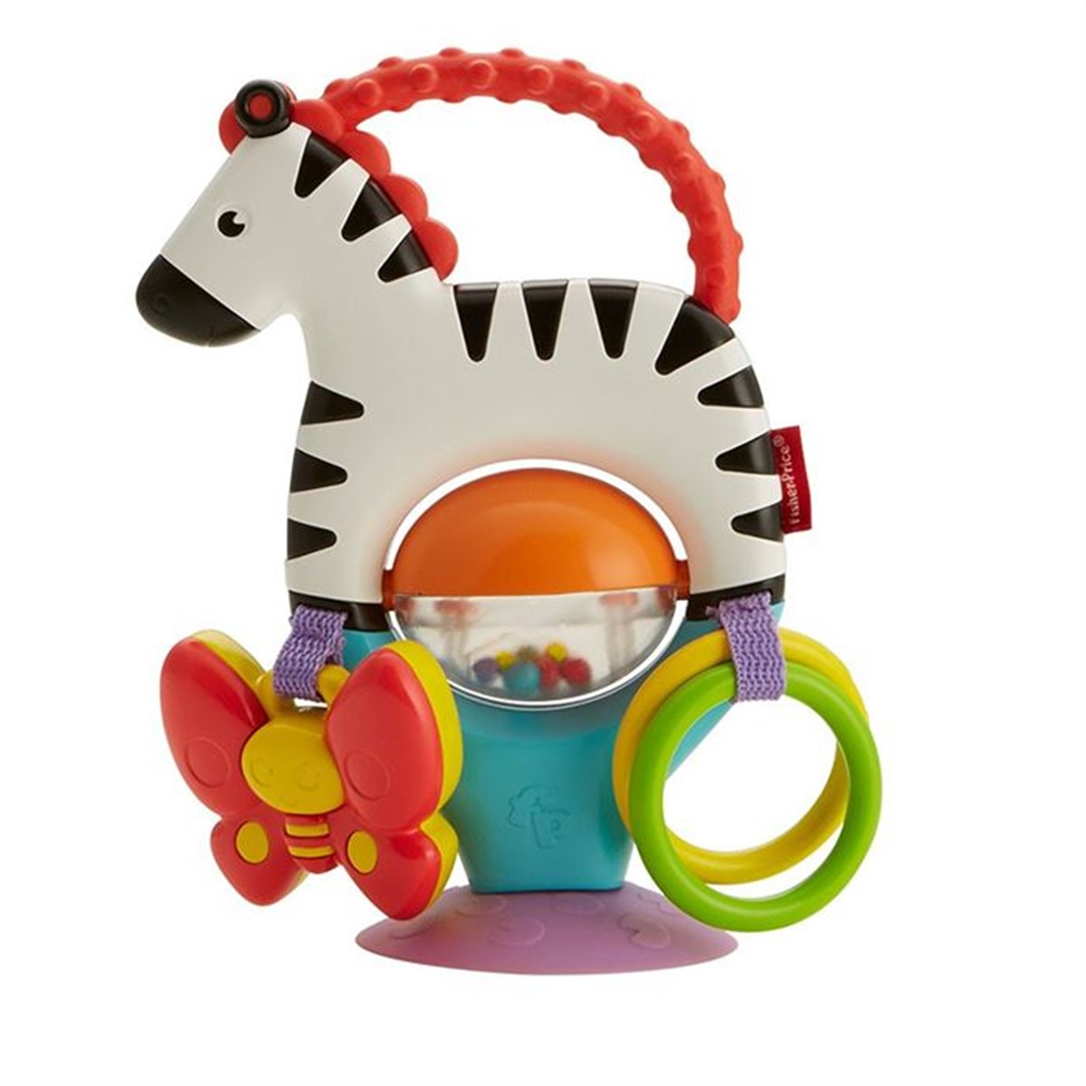 - Bu eğlenceli zebra, kontrast renklere, dişlemeye uygun bir tutma koluna, çıngıraklı dönen topa ve sallanan bir kelebeğe sahiptir.