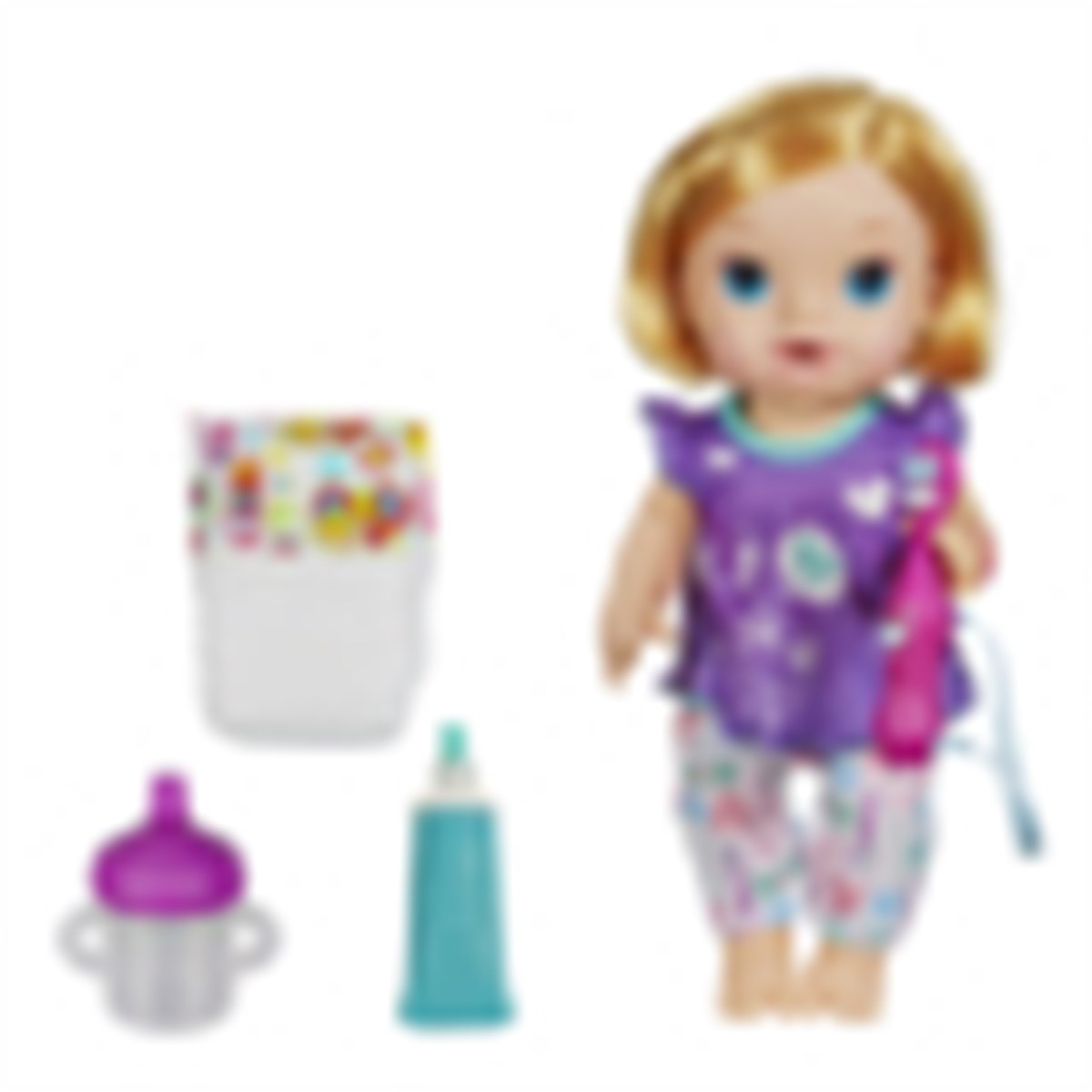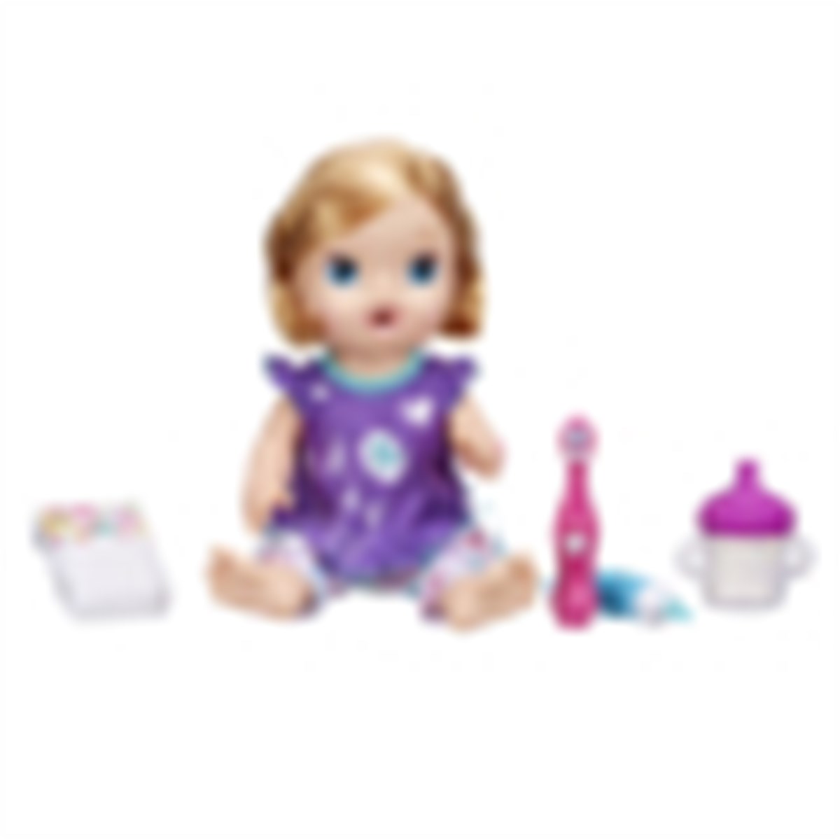 Kutuya biberon, 1 bez, başlığı dönen oyuncak diş fırçası ve oyuncak diş macunu