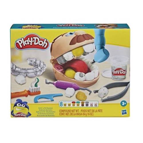- İçindekiler: hasta, dolgu aleti, tel silindiri, diş kalıbı, diş fırçası, şırınga aleti, ayna, sond, diş ipi, plastik cımbız ve 8 kutu Play-Doh Oyun Hamuru (toplam net ağırlık 454 gr).