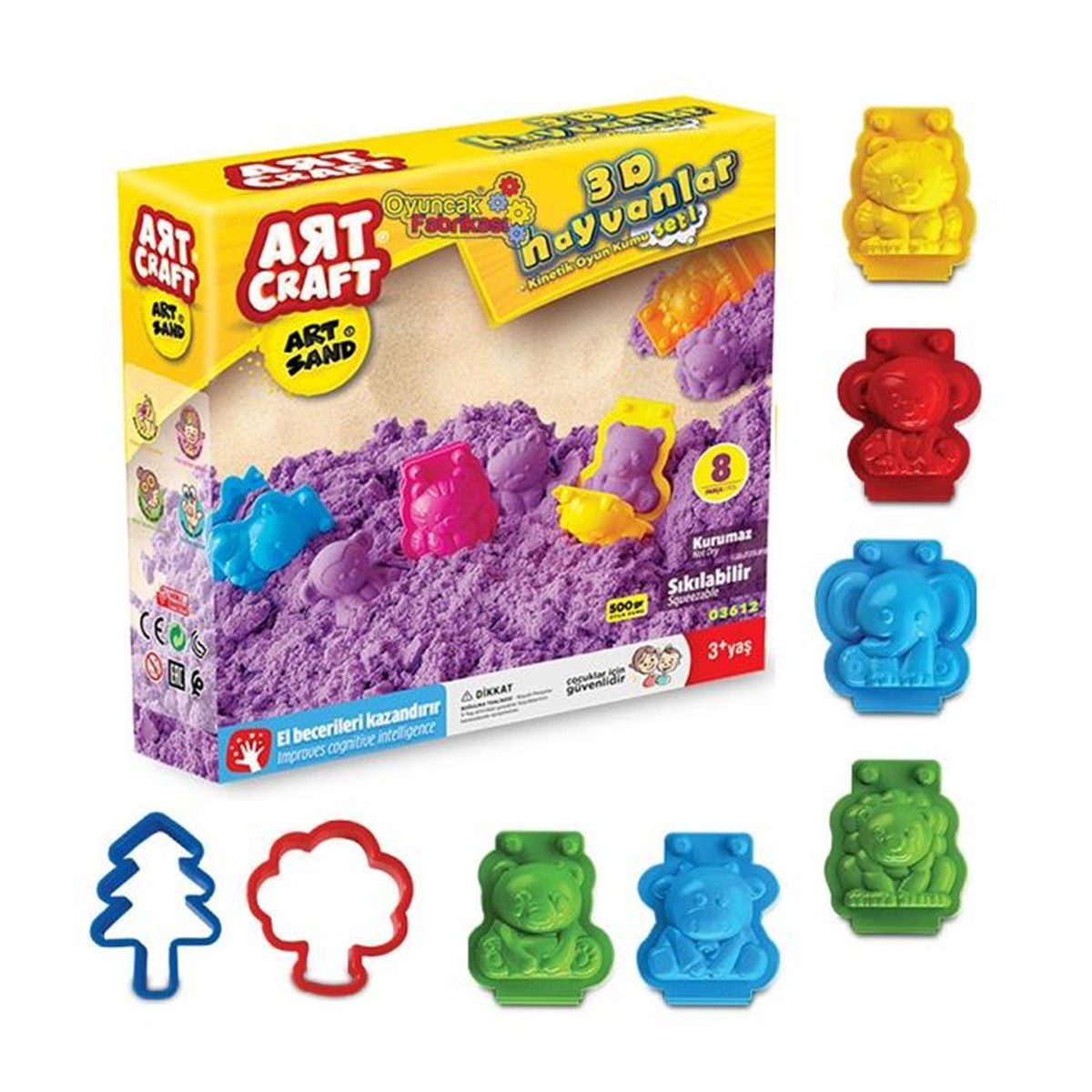 - 3D Hayvanlar Kinetik Kum Seti 500gr:içerisinde 7 parça hayvan figürleri ve 500 gram kinetik kum mevcuttur.