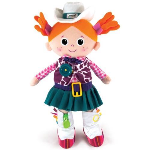 Kovboy kız bebeğin düğmeli yeleği, boynundaki fuları, tokalı kemeri, fermuarlı botu ve bağcıklı diğer botu çocuğunuzun kendi kendine giyinebilme becerisini geliştirmek üzere özel olarak tasarlanmıştır.