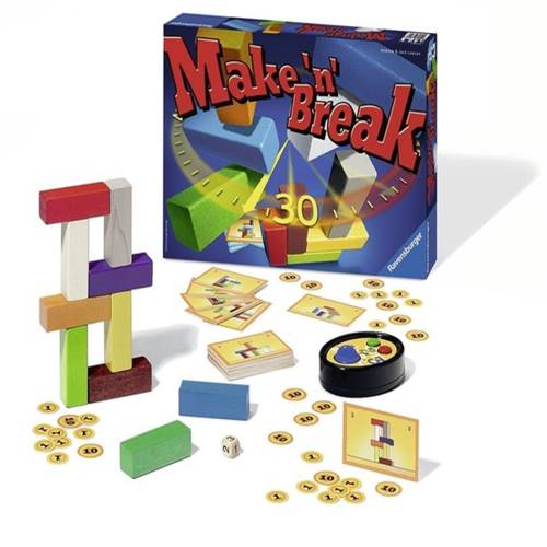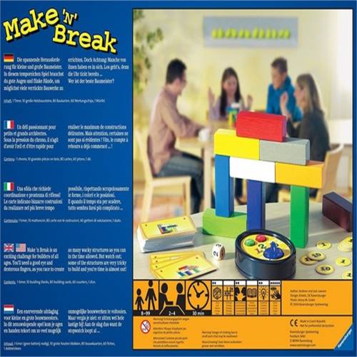 Ravensburger´ın en eğitici aile oyunlarından Make´n´Break´te amaç, zamana karşı yarışırken aynı zamanda ahşap blokları kartlardaki şekillere göre hatasız dizmektir. Nefes kesen bir heyecan ile sürüp giden bu oyun, zamana karşı yarış, zeka ve el becerisinin gelişimine katkı sağlar.