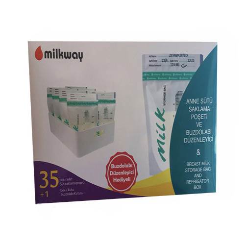 - Milkway Anne sütü saklama poşeti Muhafaza Kutusu Her biri 160 ml hacminde süt alan 35 adet poşetten oluşur.